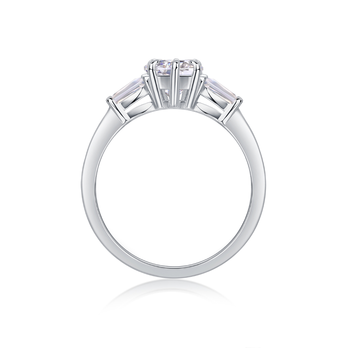 This ring features a classic trilogy design with three baguette-shaped stones set in a refined arrangement. Crafted with attention to detail, it offers a balanced and elegant appearance suitable for various occasions.
